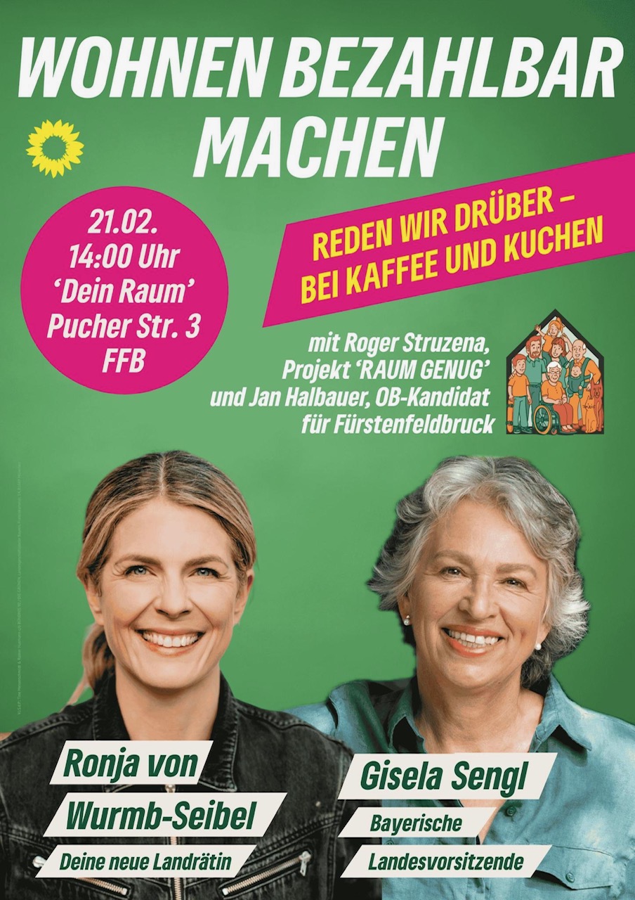 Gisela Sengl, Landesvorsitzende in Bayern und langjährige Abgeordnete des Bayerischen Landtags, bringt die landespolitische Perspektive ein. Sie setzt sich seit Jahren für soziale Wohnraumpolitik, nachhaltige Flächennutzung und starke Kommunen ein. Ebenfalls zu Gast ist Jan Halbauer, unser OB-Kandidat für Fürstenfeldbruck, der das Thema Wohnen als eines seiner Hauptthemen im Wahlkampf aufgreift. Schließlich freuen wir uns auf Roger Struzena vom Grafrather Projekt „RAUM GENUG“. Das Projekt steht für innovative, gemeinwohlorientierte Wohnformen und zeigt konkret, wie bezahlbares Wohnen durch gemeinschaftliche Nutzung, flächensparendes Bauen und neue Eigentumsmodelle gelingen kann. „RAUM GENUG“ verfolgt das Ziel, Wohnraum bedarfsgerecht, ökologisch und sozial gerecht zu schaffen. Das Projekt zielt darauf ab, ungenutzten Wohnraum zu aktivieren und dadurch mehr Wohnraum zu schaffen. Durch Umbauten oder Wohnungsteilungen kann die Wohnfläche für mehr Personen erhöht werden , was besonders wichtig ist, wenn Kinder aus dem Haus sind oder ein Ehepartner verstirbt.